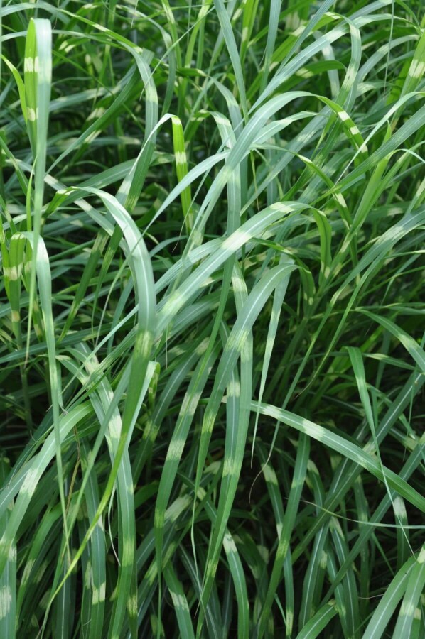 • Die Blätter des Zebraschilfs zeigen sich im Frühjahr und Sommer in einem lebendigen Grün mit horizontalen gelben Streifen, was ihm sein charakteristisches zebragemustertes Aussehen verleiht.