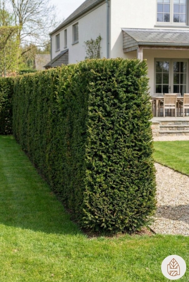 Die Taxus baccata ist eine ausgezeichnete Wahl für eine Koniferenhecke, die sowohl im Vorgarten als auch als hohe Hecke gut aussieht. Sie wächst 20-40 cm pro Jahr und bleibt das ganze Jahr über grün.
