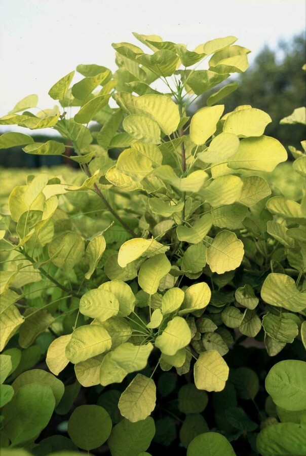 • Die Rinde und Zweige der Cotinus coggygria 'Golden Spirit' sind unauffällig, da der Fokus auf dem dekorativen gelben und grünen Laub liegt.
