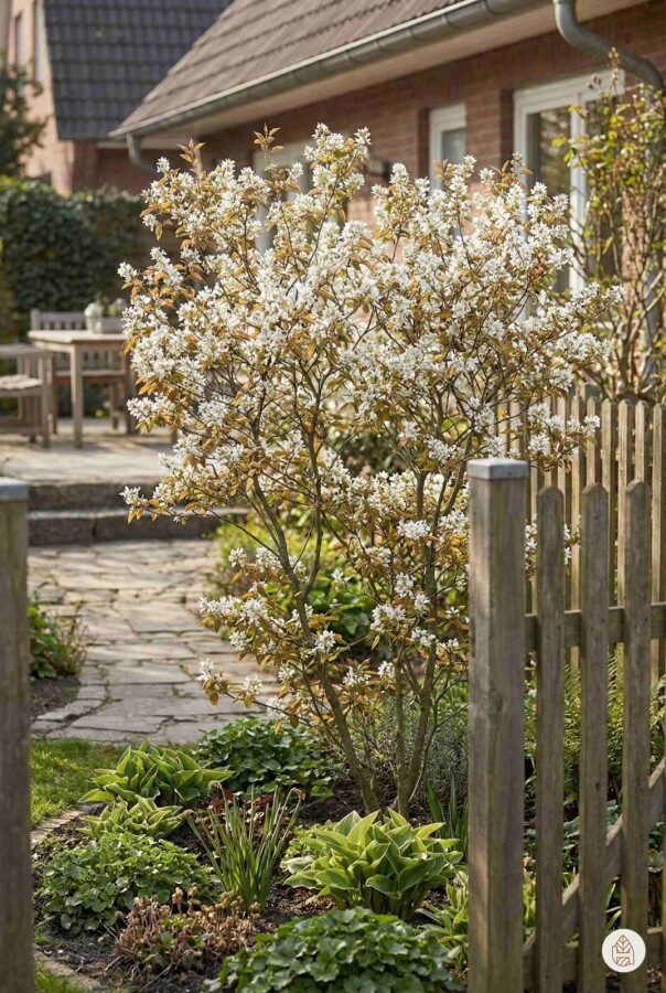 • Amelanchier lamarckii blüht im April und Mai mit weißen Blüten, die besonders Bienen anziehen.