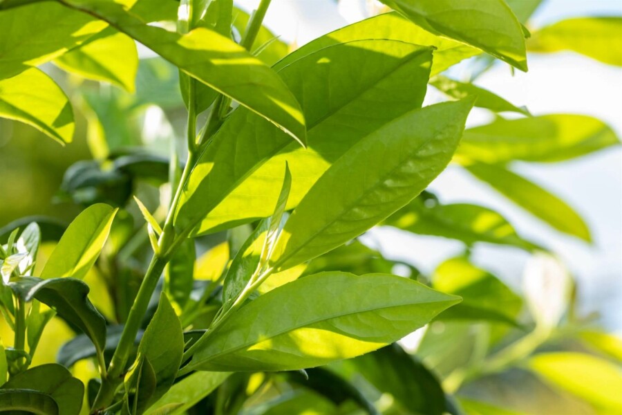 Der Kirschlorbeer-Spalierbaum (Prunus laurocerasus 'Novita') ist vollkommen immergrün und präsentiert das ganze Jahr über eine frischgrüne, dichte Hecken- oder Spalierform.