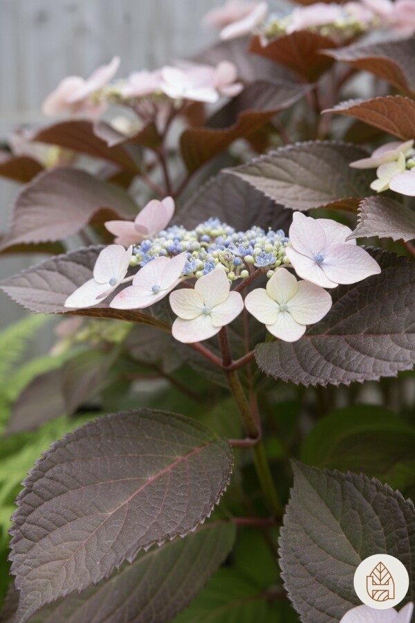 Die Hydrangea aspera 'Hot Chocolate' beeindruckt mit ihren einzigartigen, schokoladenbraunen Blättern und zarten, rosa Blüten, die im Sommer erscheinen. Diese raue Hortensie zieht Bienen und Schmetterlinge an und ist ideal für schattige Gartenbereiche geeignet. Zudem bietet sie im Herbst eine schöne Farbveränderung und erfordert nur wenig Pflege.