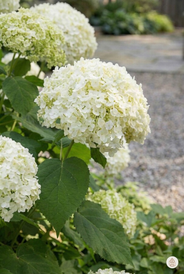 Die Schneeball-Hortensie 'Annabelle', bekannt als Hydrangea arborescens 'Annabelle', beeindruckt mit ihren großen, weißen Blütenbällen, die von Juli bis September blühen. Diese pflegeleichte Pflanze ist ideal für sonnige bis schattige Standorte und gedeiht auf allen gut durchlässigen Böden. Ein besonderes Merkmal ist ihre Fähigkeit, auch nach einem Rückschnitt im Frühjahr reich zu blühen.